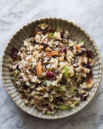 Mix the rice with the dried cranberries, pecans, green onions in a medium bowl.