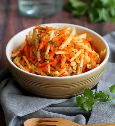 Place the Jicama , carrots, jalapeno and cilantro in a bowl.